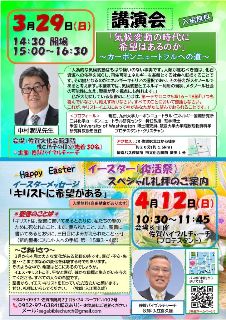 ①3月29日㈰講演会「気候変動の時代に希望はあるのか。カーボンニュウトラルへの道」中村潤児 九州大学 特任教授. ②4月12日㈰イースタースペシャル礼拝 「キリストに希望がある。」入江 喜久雄牧師
