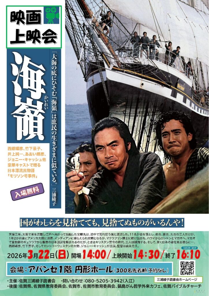原作:三浦綾子。映画「海嶺」上映会 決定。3月22日㈰14時開場、14時30分開演、上映開始。