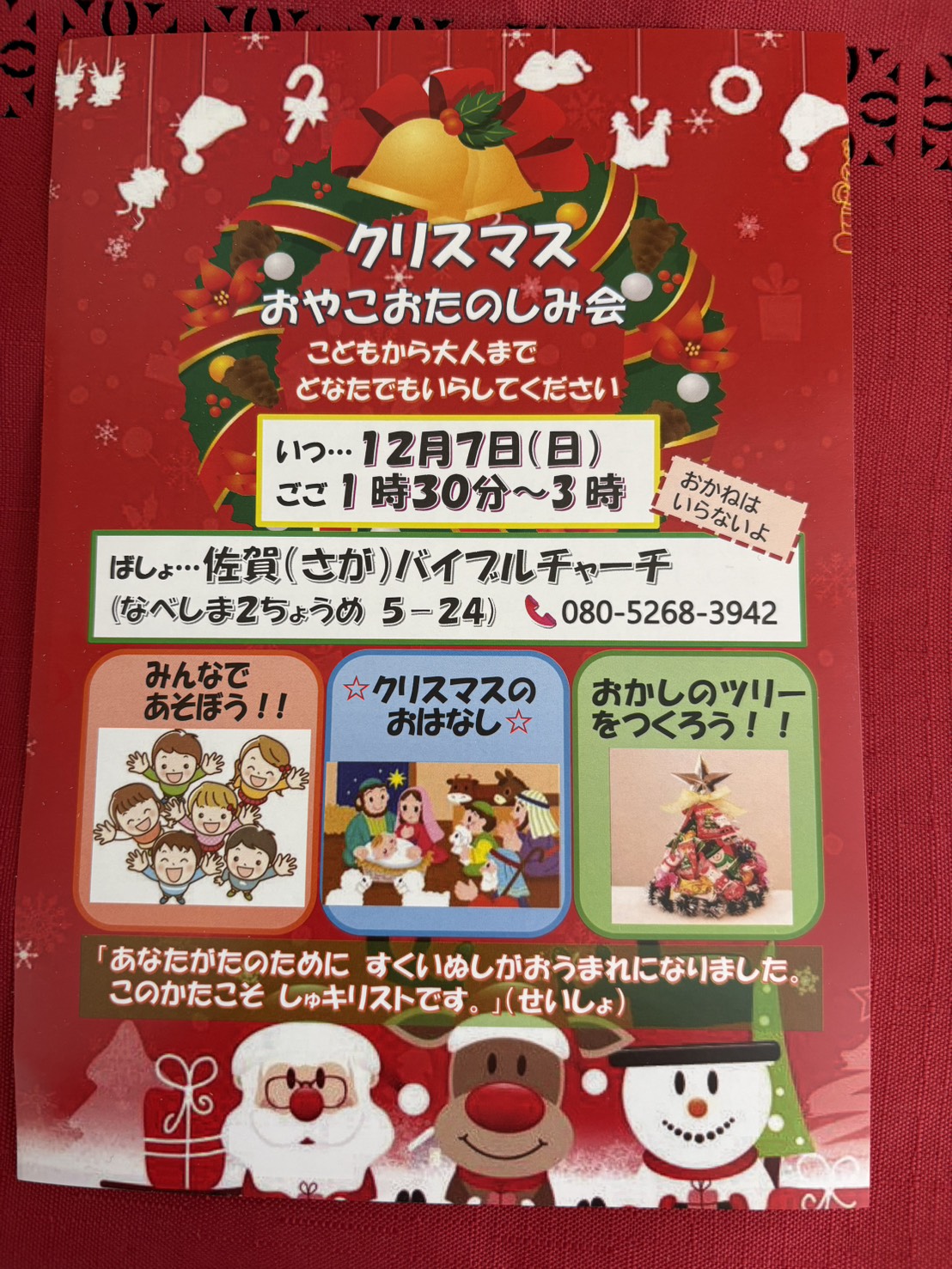 クリスマス。おやこおたのしみ会。12月7日13時半~15時。