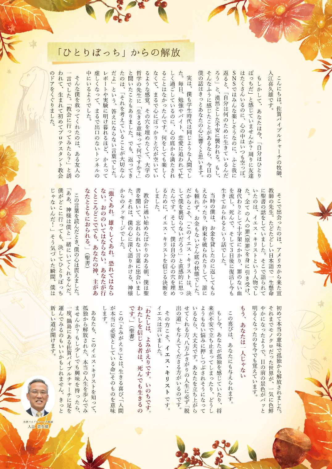 9月28日「愛に満ちた世界へ」あなたをご招待します。北海道、室蘭市から齋藤謙治牧師が佐賀へ来る。